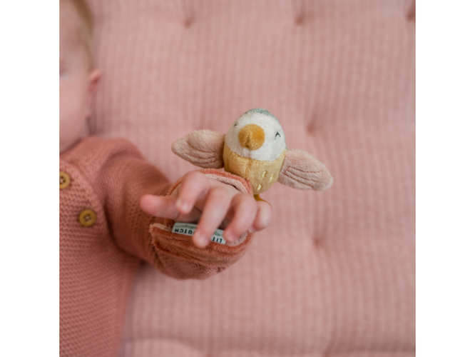 Měkké chrastítko s roztomilým ptáčkem snadno připevníte na ruku dítěte s pomocí úchytu na suchý zip. Hračka z jemného plyšového materiálu chrastí, šustí a láká dítě ke zkoumání.