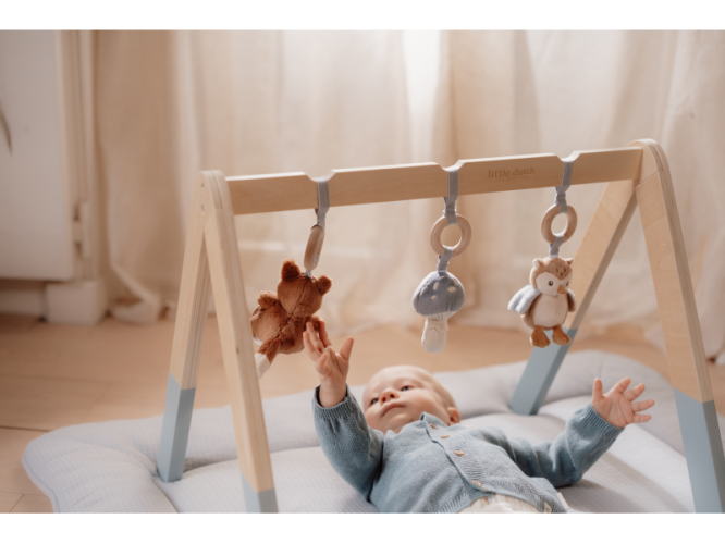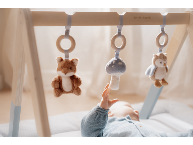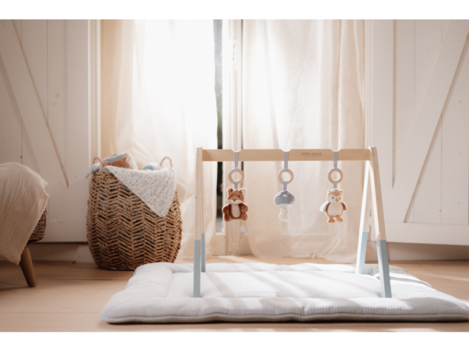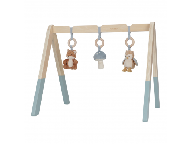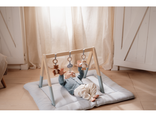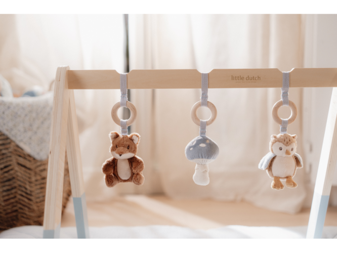 Stylová dřevěná hrazdička se třemi zavěšenými plyšovými hračkami v podobě lišky, sovy a houbičky poskytne vašemu miminku spoustu zábavy při hraní na dece. Jednotlivé hračky lákají dítě ke zkoumání a dotýkání, při pohybu chrastí a šustí. Odnímatelné hračky je možné používat i samostatně.