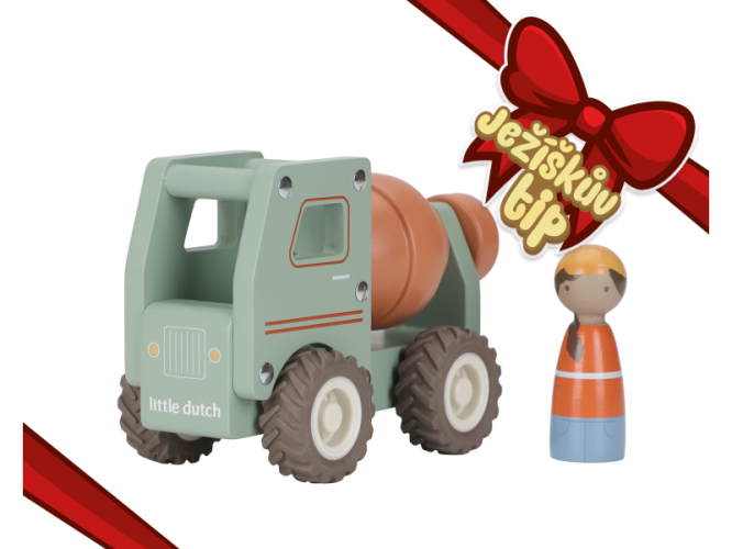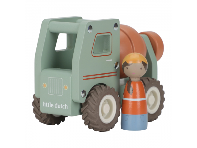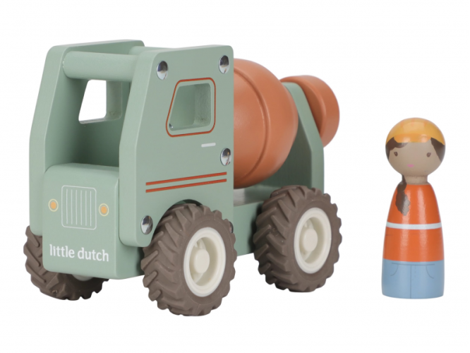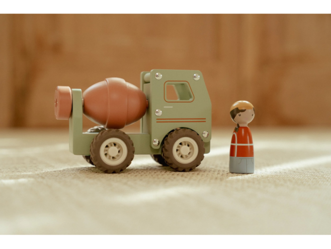 Součástí hračky je dřevěná figurka stavbyvedoucího, která dodá hře ještě více zábavy a realismu. Míchačku můžete kombinovat s dalšími stavebními vozidly – například s nakladačem, autojeřábem nebo sklápěčkou – pro kompletní stavební dobrodružství.
