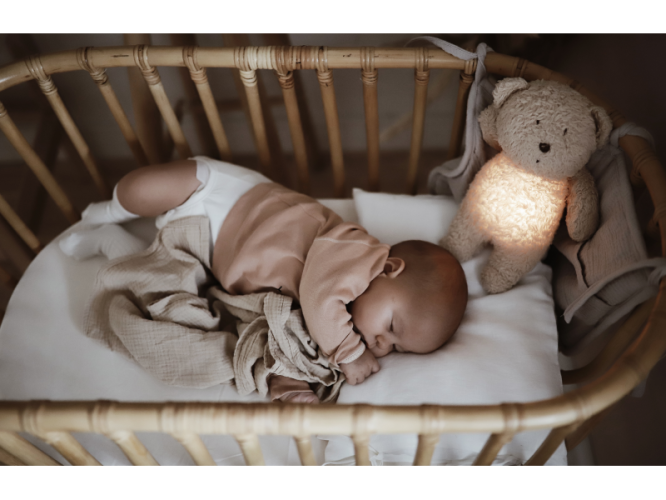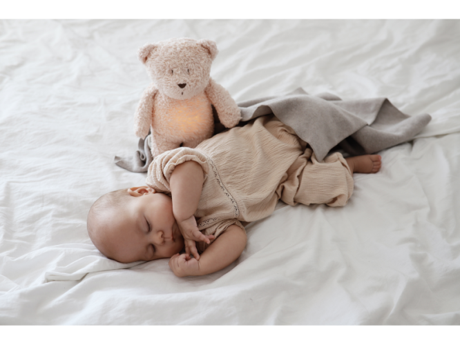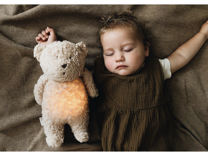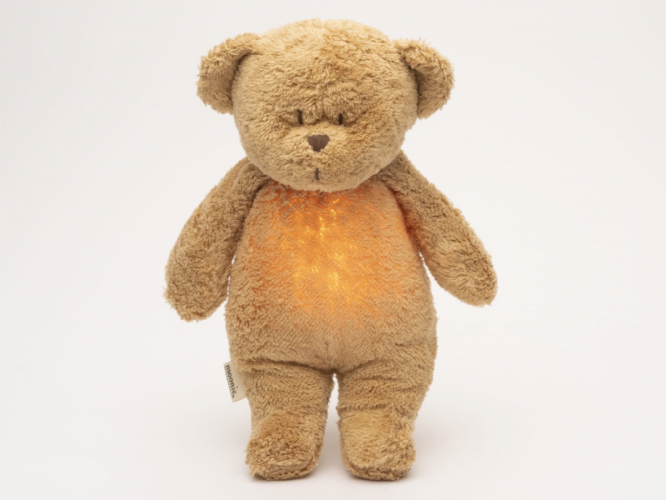 Bříško medvídka svítí a slouží jako noční světlo s výběrem sedmi barev svícení. Jemné světlo pomáhá dítěti cítit se v postýlce bezpečně. Světlo je možné zapnout i bez zvuků. Při zapnuté funkci Shake světlo zapnete zatřesením hračkou. Medvídek se při svícení nijak nezahřívá a je pro dítě zcela bezpečný.
