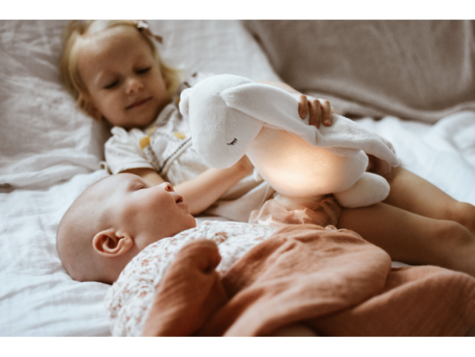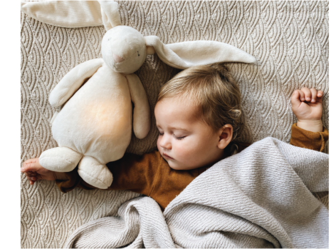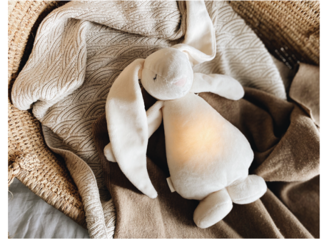 Bříško zajíčka svítí a slouží jako noční světlo s výběrem sedmi barev svícení. Jemné světlo pomáhá dítěti cítit se v postýlce bezpečně. Světlo je možné zapnout i bez zvuků. Při zapnuté funkci Shake světlo zapnete zatřesením hračkou. Zajíček se při svícení nijak nezahřívá a je pro dítě zcela bezpečný.
